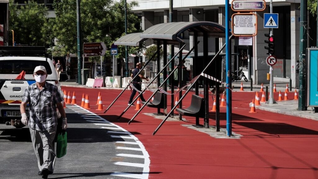Κάτω από την πλατεία Συντάγματος έχει επεκταθεί ο «Μεγάλος Περίπατος της Αθήνας», με νέες πεζοδρομήσεις οι οποίες δημιουργούν περισσότερο χώρο για πεζούς και ποδήλατα. Παράλληλα, όπως φαίνεται και από τις φωτογραφίες, οι στάσεις των λεωφορείων και των τρόλεϊ έχουν μετακινηθεί πιο μέσα προς τον δρόμο.