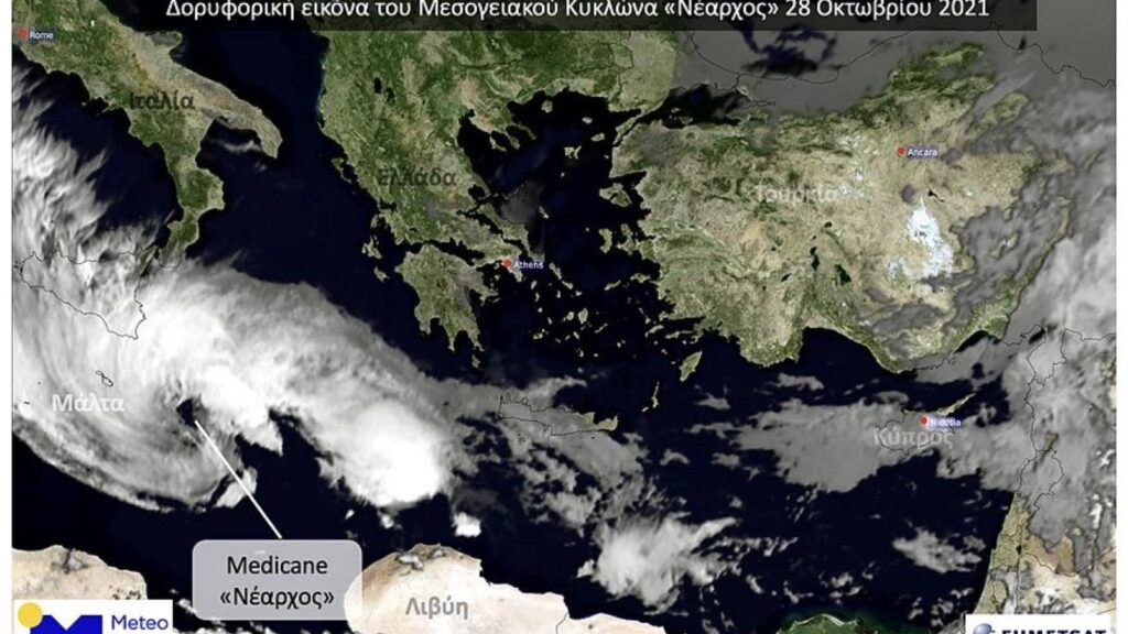 Η δορυφορική εικόνα (εξωτερική φωτογραφία) δείχνει τον Νέαρχο το απόγευμα της Πέμπτης 28 Οκτωβρίου 2021 στην Κεντρική Μεσόγειο όπου κινείται πολύ αργά βορειοδυτικά προς τη Μάλτα και τις ακτές της Σικελίας.