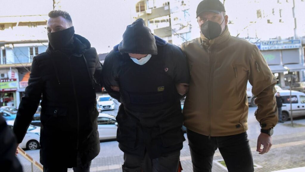 Απόκριση: θυμάμαι μόνο τα χαρακτηριστικά του ενός αυτό που σας είπα οτι προπορευόταν και κρατούσε το δρεπάνι. Αυτός φορούσε μία μαύρη λαιμούδιερα, μαύρη σηκωμένη μέχρι το ύψος της μύτης. Ήταν ηλικίας περίπου 21 ετών, ύψος περίπου 175 – 180 cm και είχε λίγα παραπανίσια κιλά. Είχε καστανόξανθα μαλλιά πολύ κοντά στο πλάι και πολύ μεγαλύτερα στο επάνω μέρος του κεφαλιού του. Αυτός ήταν ο μόνος που δε φορούσε κουκούλα στο κεφάλι και γι’ αυτό μπορεσα να διακρίνω τα χαρακτηριστικά του. Ερώτηση: αναγνωρίζεις τον εικονιζόμενο στη φωτογραφία. Αστυνομικός δείχνει τον αλβανό συλληφθέντα.