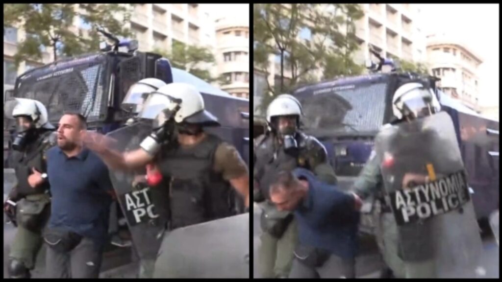 Άνδρας των ΜΑΤ ρίχνει μπουνιά σε δεμένο πισθάγκωνα