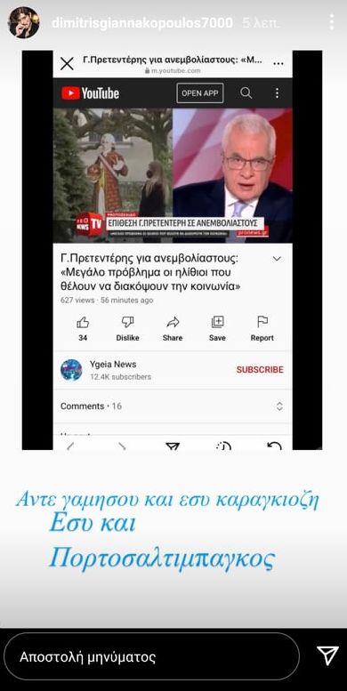 Ο γνωστός επιχειρηματίας έγραψε χαρακτηριστικά στα stories του στο Instagram: “Άντε γ@@@@ κι εσύ καραγκιόζη και ο πορτοσαλτιμπάγκος”.