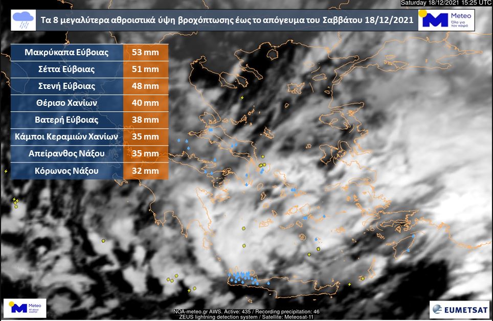 Σύμφωνα με την εικόνα του ευρωπαϊκού μετεωρολογικού δορυφόρου Meteosat-11, την οποία επεξεργάστηκε το Εθνικό Αστεροσκοπείο Αθηνών / meteo.gr, τις απογευματινές ώρες του Σαββάτου 18/12 φαινόμενα εκδηλώνονται στην Εύβοια, στην Κεντρική και Ανατολική Στερεά, στις Κυκλάδες και στην Κρήτη, ενώ σημαντικά ύψη βροχής καταγράφονται στην Εύβοια με το μεγαλύτερο ύψος να καταγράφεται στην Μακρυκάπα Εύβοιας με 53 mm.