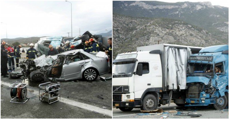 Οι τρεις νταλίκες μετέφεραν εμφιαλωμένα κρασιά και κατευθύνοντας προς την Κόρινθο. Η μία νταλίκα “δίπλωσε” πάνω στο στηθαίο, πέρασε στο αντίθετο ρεύμα και πλάκωσε ένα αυτοκίνητο μάρκας Audi. Οι δύο επιβάτες απεγκλωβίστηκαν, ύστερα από δραματικές προσπάθειες και μεταφέρθηκαν στο Γενικό Κρατικό Νίκαιας με πολύ σοβαρά τραύματα.
