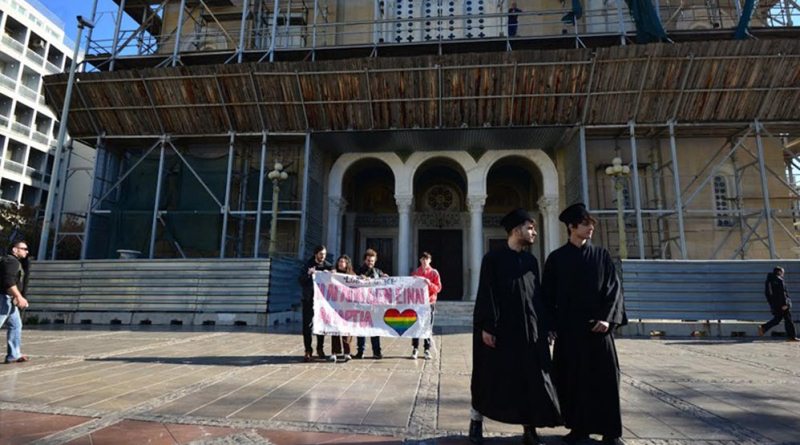 Από τις 12 το μεσημέρι έξω από τον ναό βρίσκονται περίπου δέκα άτομα που θέλουν να διαμαρτυρηθούν για τις αντιδράσεις των ιεραρχών στην επέκταση του συμφώνου συμβίωσης και στα ομόφυλα ζευγάρια κρατώντας πανό που αναγράφει “Η αγάπη δεν είναι αμαρτία”.