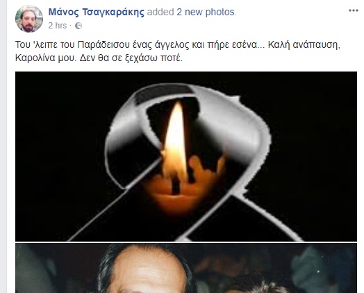 Η άτυχη Καρολίνα εντοπίστηκε από τους πυροσβέστες νεκρή μέσα στη μονοκατοικία και τη δυσάρεστη είδηση επιβεβαίωσε ο δημοσιογράφος Μάνος Τσαγκαράκης. Ο δημοσιογράφος που είχε φιλικές σχέσεις με την Καρολίνα έγραψε στο προφίλ του : «Του λειπε του Παράδεισου ένας άγγελος και πήρε εσένα… Καλή ανάπαυση Καρολίνα μου δεν θα σε ξεχάσω ποτέ»