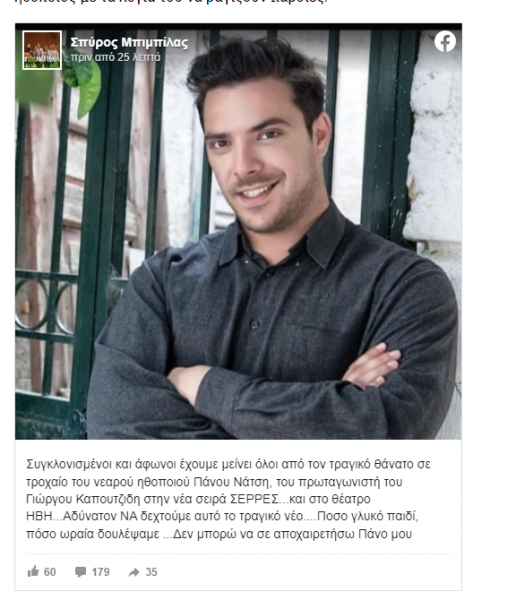 “Συγκλονισμένοι και άφωνοι έχουμε μείνει όλοι από τον τραγικό θάνατο σε τροχαίο του νεαρού ηθοποιού Πάνου Νάτση, του πρωταγωνιστή του Γιώργου Καπουτζίδη στην νέα σειρά ΣΕΡΡΕΣ και στο θέατρο ΗΒΗ.