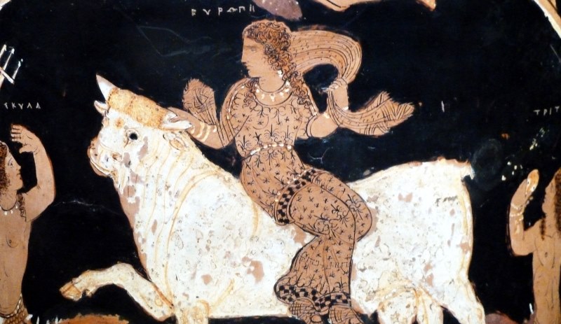 Για να την πλησιάσει μεταμορφώθηκε σε κάτασπρο ταύρο. Βλέποντας η Ευρώπη τον ήσυχο ταύρο, πήγε κοντά του, τον χάιδεψε λίγο και, αφού βεβαιώθηκε ότι δεν αγριεύει, κάθισε πάνω στη ράχη του.