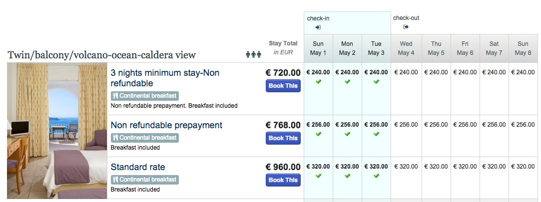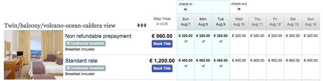 Χρησιμοποιώντας πάλι το παράδειγμα Σαντορίνης, αποδεικνύει ότι η διαμονή σε ένα ξενοδοχείο 6 ή 8 εβδομάδες πριν ή μετά την high season είναι υπερβολικά πιο οικονομική με τις τιμές στις αρχές του Μάη (από Κυριακή έως Τετάρτη) να είναι μόλις 240 ευρώ την βραδιά σε ξενοδοχείο με υπέροχη θέα (στην προκειμένη περίπτωση χρησιμοποιεί ως παράδειγμα το Atlantis Hotel στα Φηρά), και τον Αύγουστο να σκαρφαλώνουν στα 320 ευρώ.