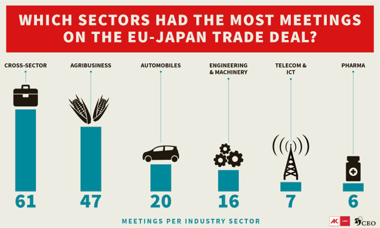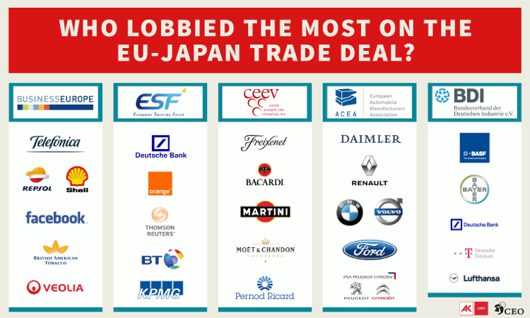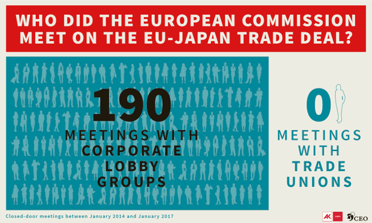 Τουλάχιστον 213 συναντήσεις κεκλεισμένων των θυρών με τα λόμπι των ισχυρότερων βιομηχανιών της Ευρώπης οργάνωσε η Ευρωπαϊκή Επιτροπή πριν από την υπογραφή της νέας εμπορικής συμφωνίας με την Ιαπωνία, η οποία θεωρείται μια από τις μεγαλύτερες στην ανθρώπινη ιστορία.