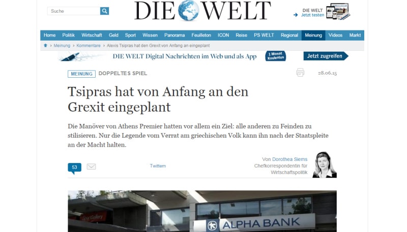 Επίθεση στην ελληνική κυβέρνηση και στον Αλέξη Τσίπρα εξαπέλυσε η γερμανική εφημερίδα «Die Welt» και καλεί τους Ευρωπαίους πολιτικούς και τους υπεύθυνους της Ευρωζώνης να διατηρήσουν τη ψυχραιμία τους και αν διαχειριστούν με ρεαλιστικό τρόπο την ευκαιρία που τους παρέχεται έτσι ώστε να μην προκληθεί αναταραχή στις αγορές με ένα Grexit.
