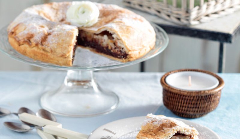 Βγάζετε την πίτα από το φούρνο και την αφήνετε να κρυώσει ελαφρώς. Πασπαλίζετε με μπόλικη άχνη ζάχαρη και κανέλα, κόβετε σε κομμάτια και σερβίρετε στα πιάτα. Προσοχή, γιατί εάν είναι πολύ ζεστή, η γέμιση θα κυλήσει προς τα έξω!