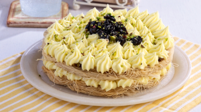 Μια εντυπωσιακή και απίστευτα λαχταριστή τούρτα που αντικαθιστά το παντεσπάνι με τραγανό, σιροπιασμένο κανταΐφι και γεμίζεται με μια πολύ αρωματική κρέμα λάιμ.