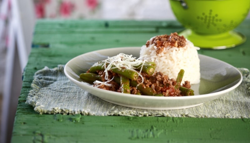 Στο μεταξύ ζεματάτε τα φασολάκια σε βραστό νερό μέχρι να μαραθούν και τα στραγγίζετε αμέσως. Τα προσθέτετε στον κιμά, ανακατεύετε καλά και μισοσκεπάζετε την κατσαρόλα. Αφήνετε το φαγητό να βράσει σε χαμηλή φωτιά για 40-50 λεπτά περίπου ή μέχρι να μαλακώσουν τα φασολάκια. Αν χρειαστεί, κατά τη διάρκεια του μαγειρέματος προσθέτετε λίγο ζωμό ή νερό. Σερβίρετε το φαγητό σε πιάτα πασπαλίζοντας με τριμμένο κεφαλοτύρι ή μυζήθρα. Συνοδεύετε με πιλάφι ή τηγανητές πατάτες.