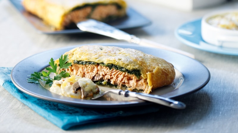 Σολομός Wellington ή αλλιώς σολομός τυλιγμένος σε φύλλο σφολιάτας παρέα με πικάντικο σπανάκι που του πάει πολύ.