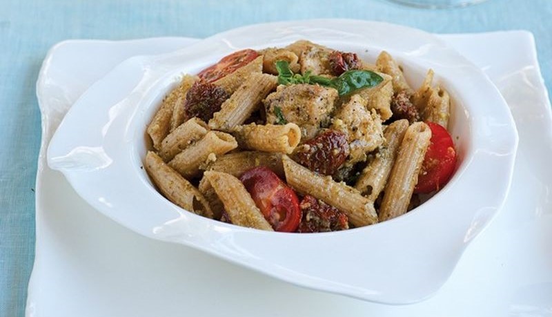 Ένα πολύ υγιεινό πιάτο με ζυμαρικά ολικής άλεσης και κοτόπουλο. Το απολαμβάνετε ως χορταστική σαλάτα ζυμαρικών αλλά και ως κυρίως πιάτο.
