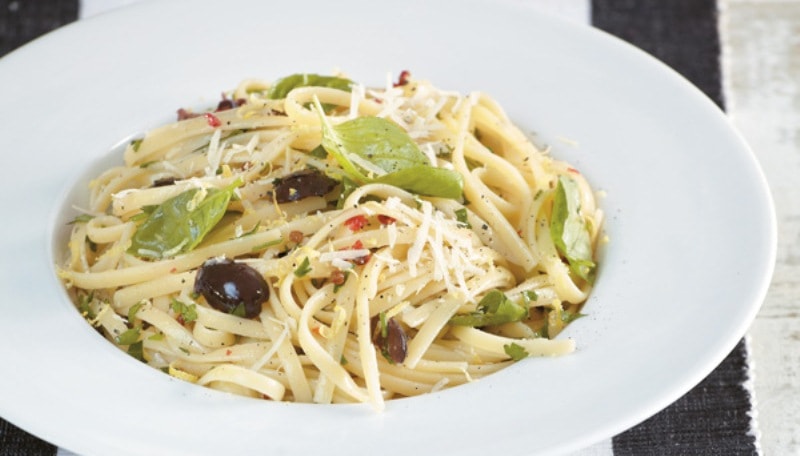 Tip: Εκτός από λιγκουίνι μπορείτε κάλλιστα να χρησιμοποιήσετε σπαγγέτι. Επίσης, μπορείτε να παραλείψετε τις ελιές αν δεν σας αρέσουν.