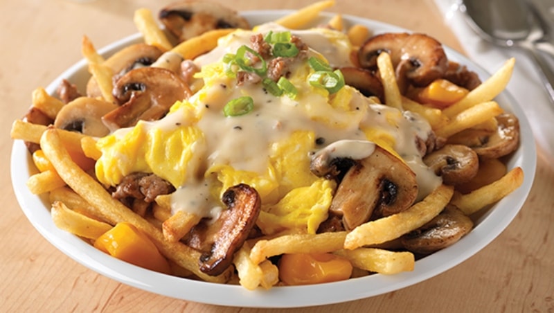 Αφήνετε τις τηγανίτες σε απορροφητικό χαρτί. Κατόπιν τις μεταφέρετε σε ταψί μεγάλο αφήνοντας αποστάσεις ανάμεσά τους. Σοτάρετε τα μανιτάρια και το κρεμμύδι στο βούτυρο για 6’-7’ και τα σβήνετε με το κρασί. Βράζετε μέχρι να εξατμισθούν εντελώς τα υγρά και μοιράζετε το μείγμα μανιταριών πάνω από τις τηγανίτες. Από πάνω σκορπίζετε το τυρί. Ψήνετε στο φούρνο μέχρι να λιώσει το τυρί.