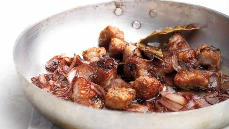 Προσθέτετε το χοιρινό στο τηγάνι με τα κρεμμύδια και ρίχνετε και το κρασί. Μόλις το κρασί εξατμιστεί, ρίχνετε το ζωμό του κρέατος, αλάτι και φρεσκοτριμμένο πιπέρι. Ανακατεύετε απαλά και μαγειρεύετε σε χαμηλή φωτιά έως ότου απορροφηθούν τα υγρά του και δέσει η σάλτσα.