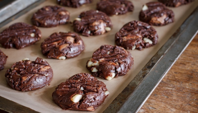 Με ένα κουτάλι κόβετε τα κούκις μοιράζοντας τη ζύμη στο ταψί αφήνοντας αρκετό διάστημα μεταξύ τους και βάζετε το ταψί στο ψυγείο για περίπου 30 λεπτά. Ψήνετε τα cookies στο φούρνο για περίπου 9 λεπτά (ανάλογα το φούρνο).