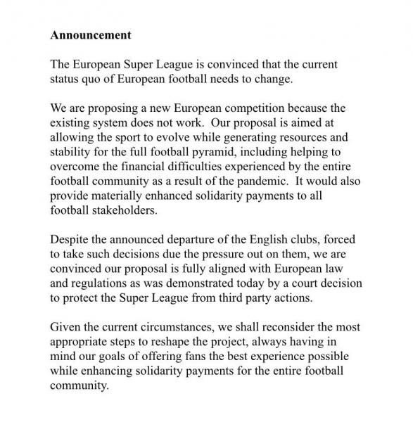 Με δεδομένη την επικρατούσα κατάσταση θα σκεφτούμε ξανά τα απαραίτητα βήματα για να αναδιοργανώσουμε το πρότζεκτ, με γνώμονα να παρέχουμε στους οπαδούς την καλύτερη ποδοσφαιρική εμπειρία και το μεγαλύτερο οικονομικό όφελο για ολόκληρη την ποδοσφαιρική κοινότητα».