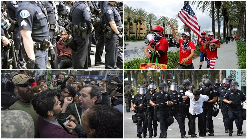 Χιλιάδες υποστηρικτές κι επικριτές του Ντόναλντ Τραμπ αναμετρήθηκαν χθες στην Καλιφόρνια, όπου ο μεγιστάνας, ο οποίος είναι πλέον βέβαιο ότι θα είναι ο υποψήφιος των Ρεπουμπλικάνων στις προεδρικές εκλογές του Νοεμβρίου, εκφώνησε δύο ομιλίες· η ατμόσφαιρα ήταν τεταμένη, με την αστυνομία—η οποία είχε αναπτύξει ισχυρές δυνάμεις—να κάνει λόγο για περιορισμένης έκτασης επεισόδια και συλλήψεις.